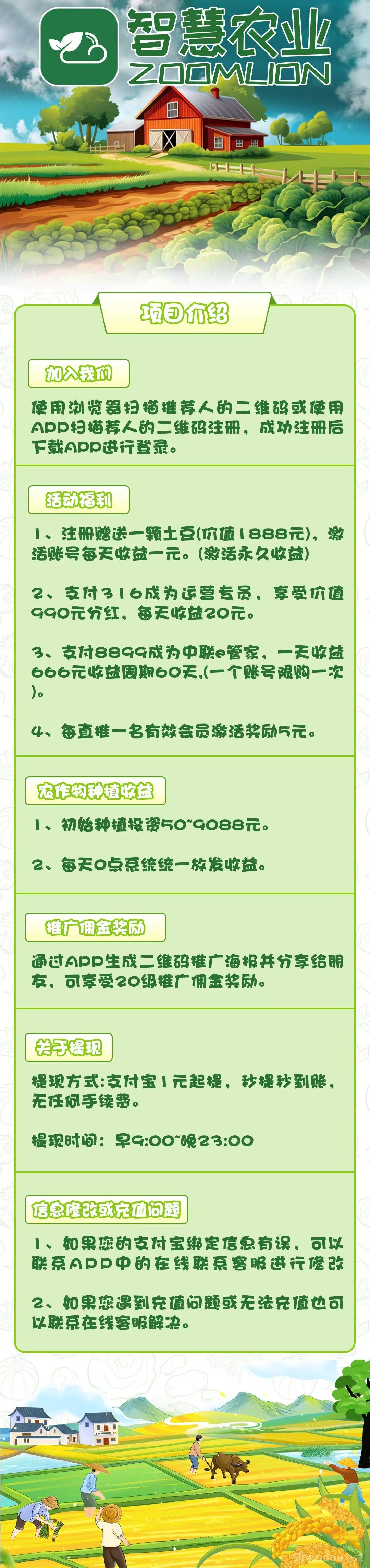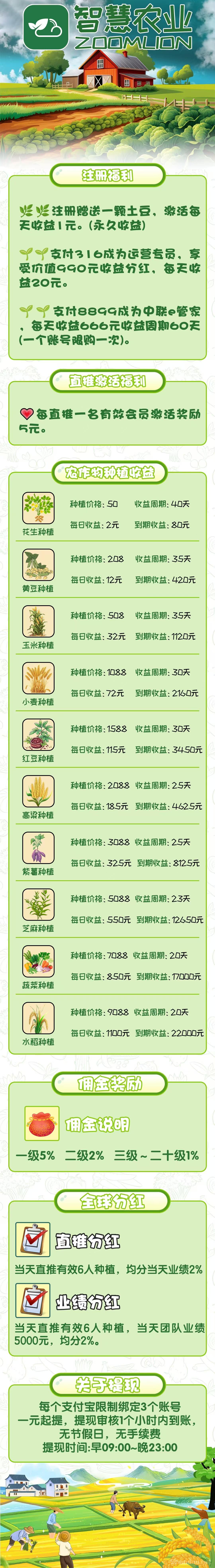 智慧农业,首码上线送18000元,投资每天0点自动收益最高1000元,7大亮点收益