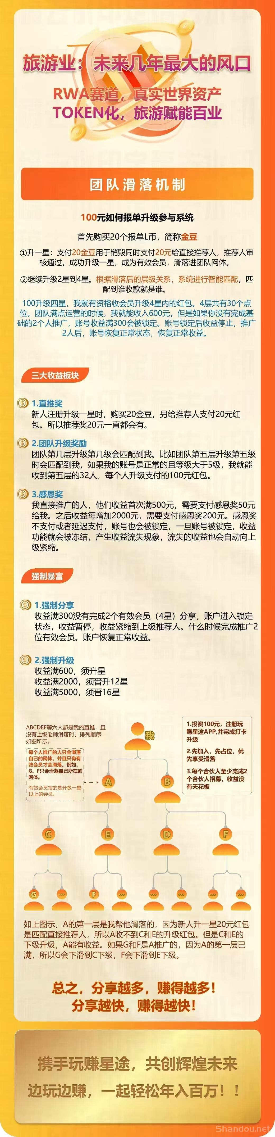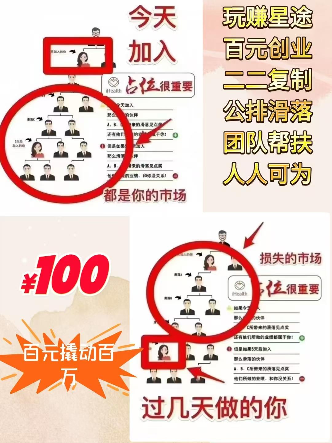 玩赚星途100块就能快速启动,不推广也会自动滑落15人收益,也就是300块,推广两个会员解锁无限滑落,收益无上限。
