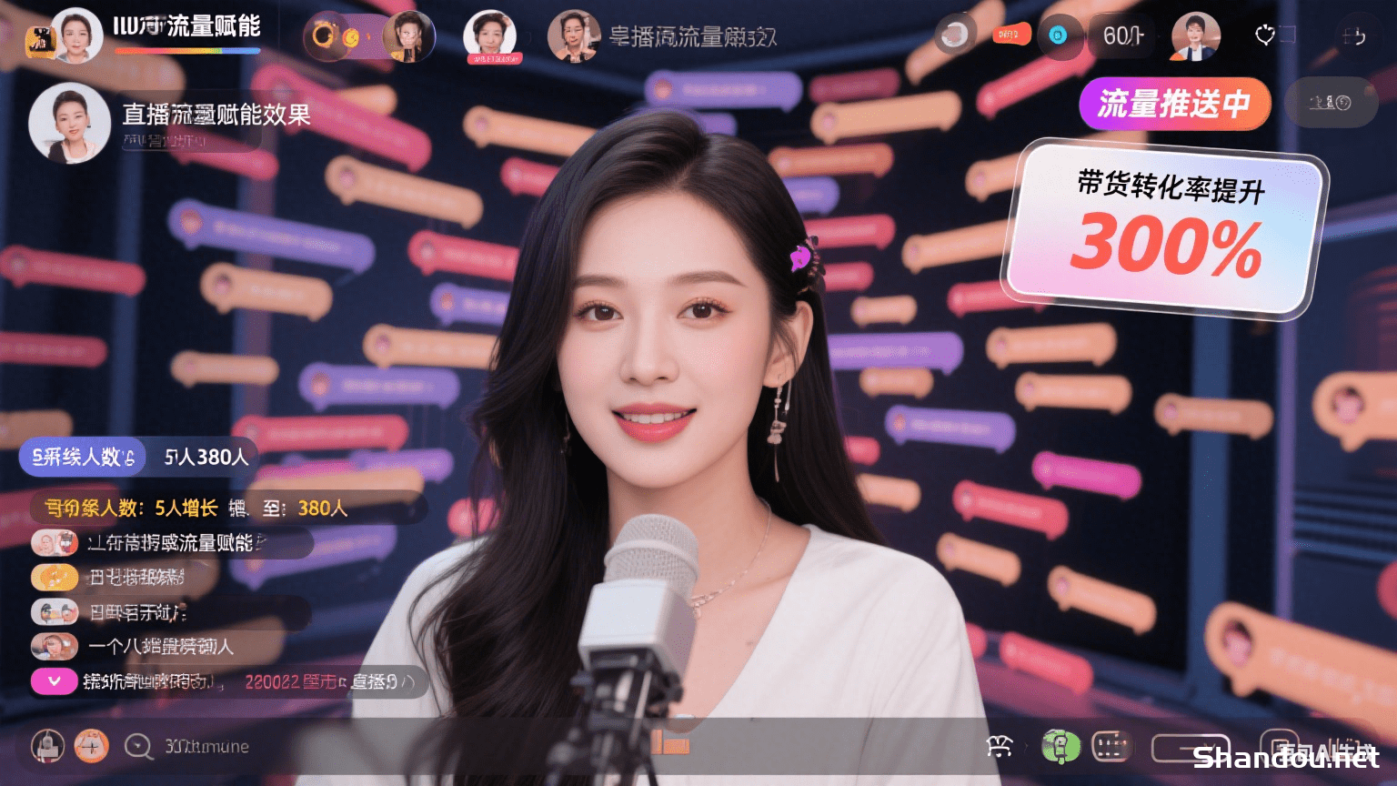 直播间赋能:解决直播没人气、闪进闪退的问题。平台会根据停留数据推流,黑科技能帮你优化初期数据,让直播间获得更多自然流量,带动带货转化。