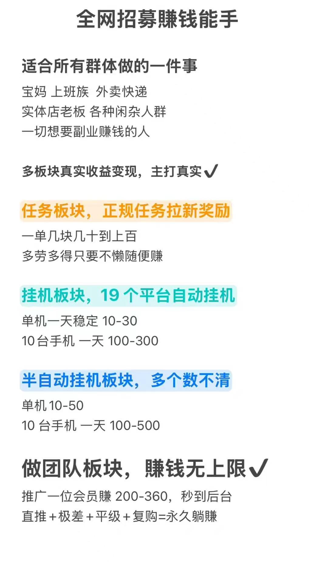 做推广团队收益轻松月入1-30W,直推奖+极差奖+平级奖+任务极差+任务平级+复购奖等,多种佣金拿不停。
