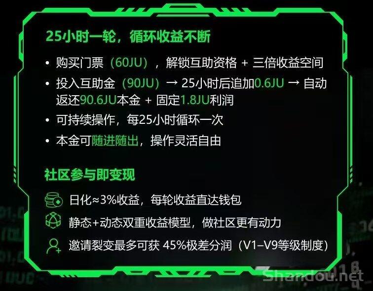 核心优势:平台公链币JU算力托底,泡沫压制算法,日收溢3%!