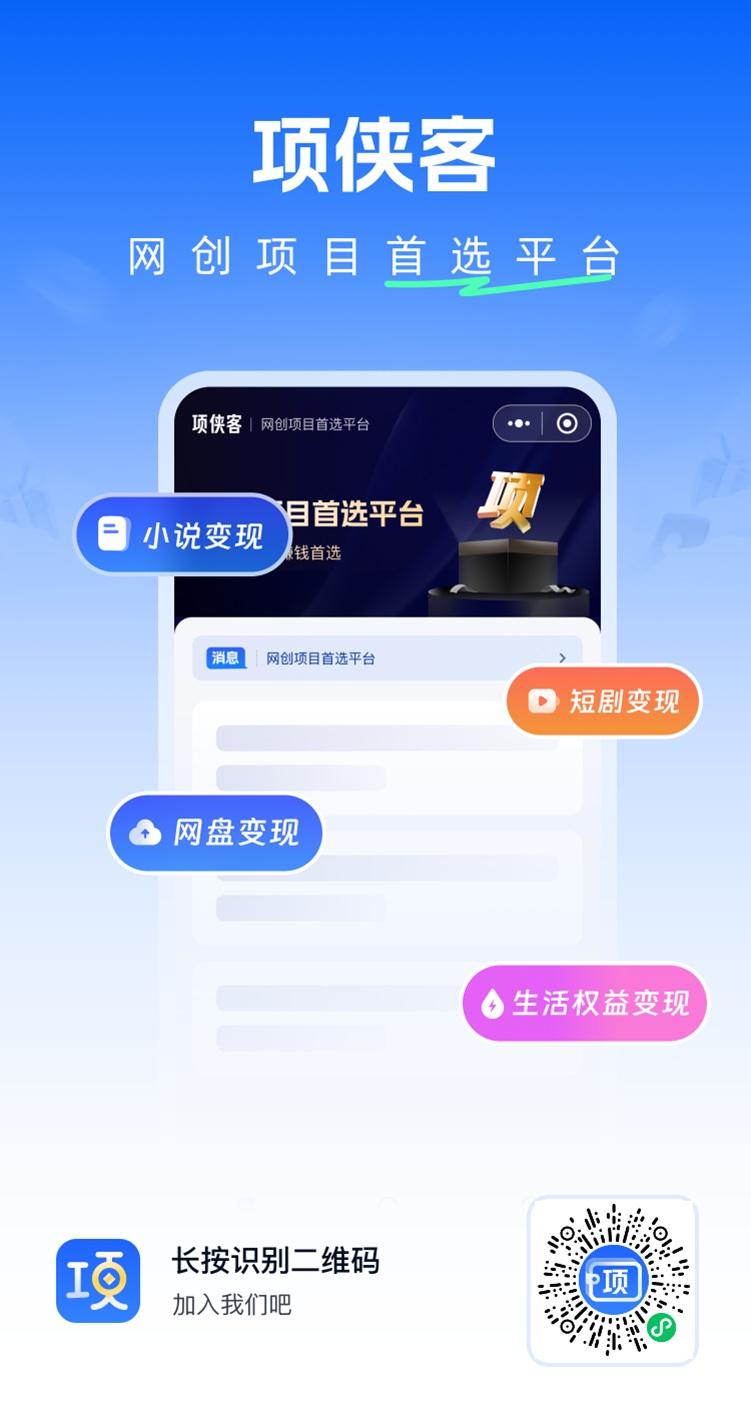 项侠客是一个零门槛网创项目平台,由深圳起点云科技集团开发运营(旗下有多个互联网变现方面的爆款app)。
