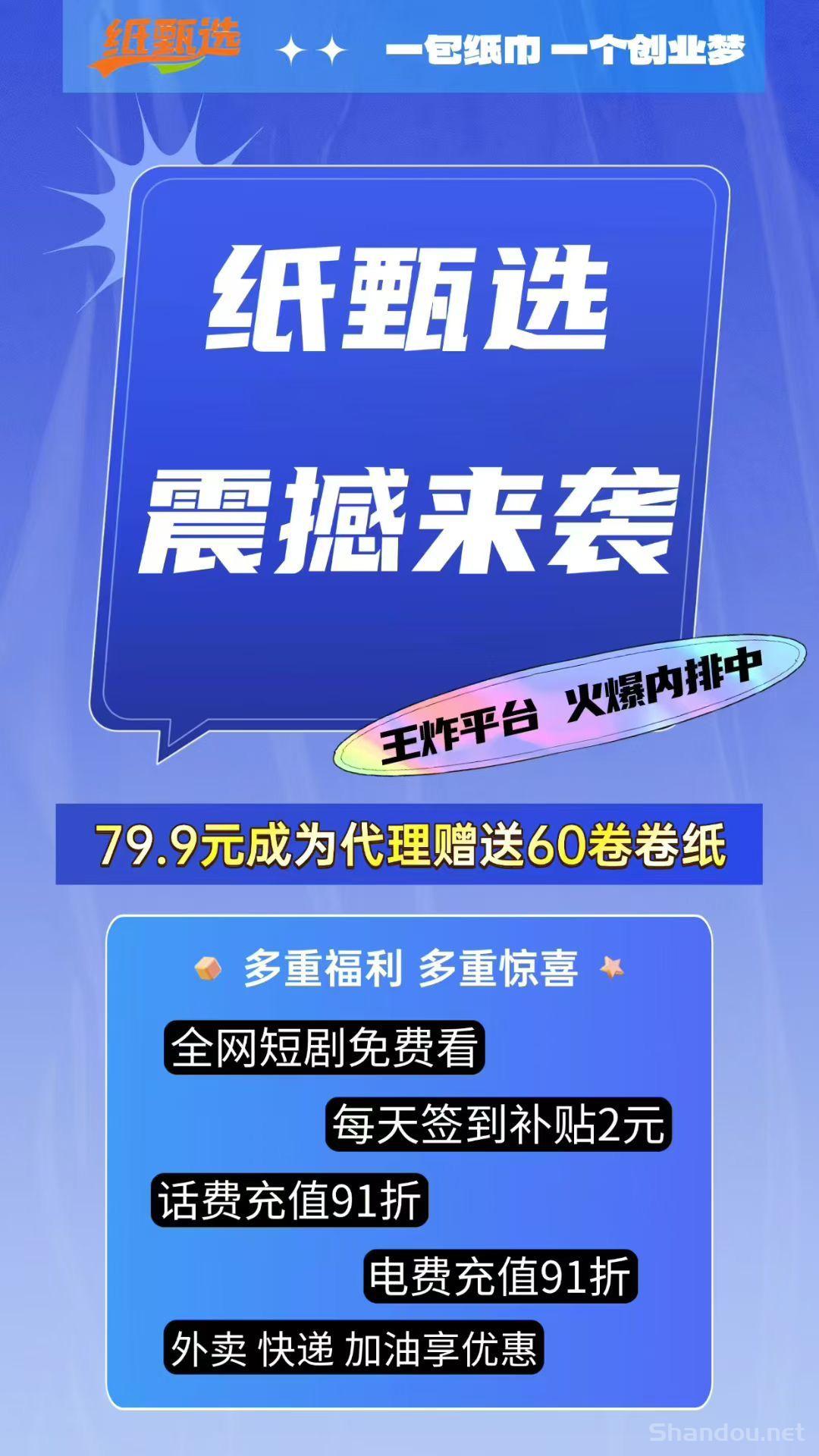 纸甄选项目现正火爆招募首码,79.9圆即可成为代哩,赠送60卷高品质卷纸,包邮直达家门。加入后每天签到还有2圆补贴,福利持续不断。平台还提供爆款短剧免费看,话费充直低至91折,电费、外卖、快递及加油等多项优惠服务,生活省钱又赚钱。