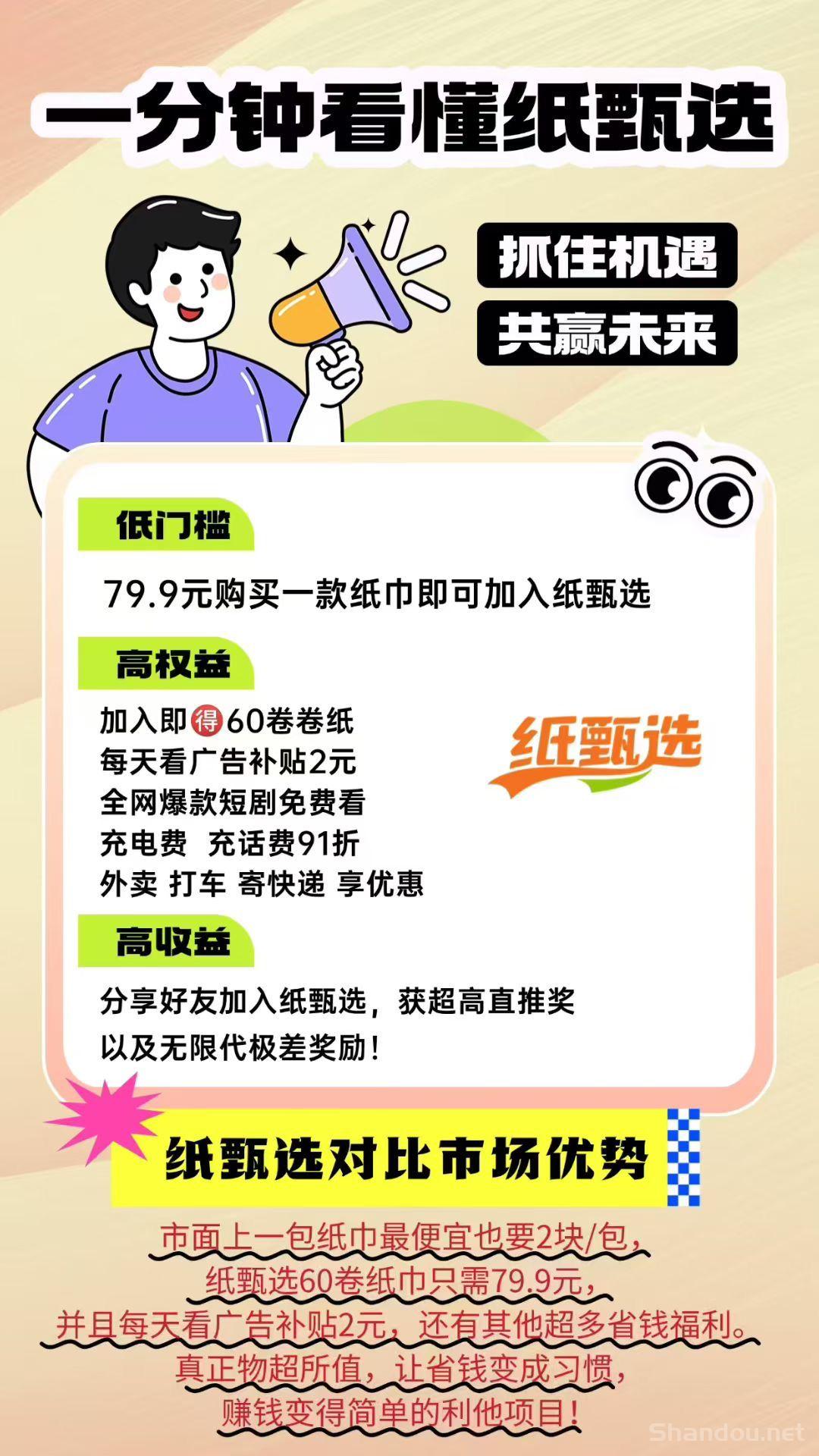 纸巾作为日常生活中的快消品,市场需求巨大。纸甄选抓住了这一商机,做到了低门槛、高回报。无论你是学生、上班族还是宝Ma,只要有手机,就能轻松参与。加入纸甄选,你不仅能享受优惠购物,还能通过分享和推广赚取收溢,长久稳定,适合长期操作。