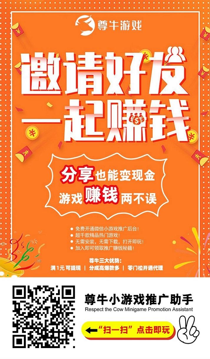 尊牛游戏平台模式非常的完善,每个人免费注册就可以玩小游戏看广告赚米,还可以邀请身边好友一起玩,好友获得奖励的同时你也可以获得奖励。