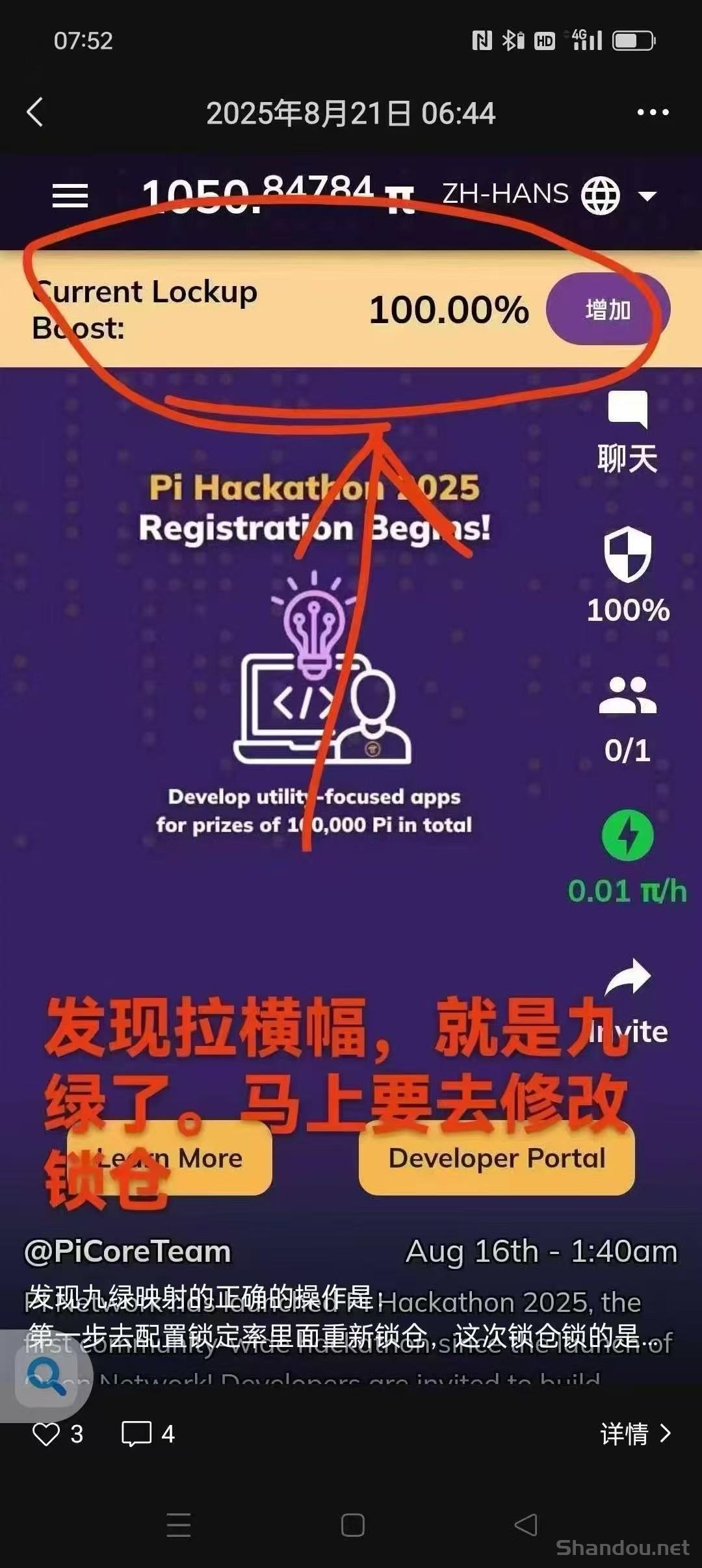 中文区目前各大社区和app内中文聊天室里已经很多再谈及9绿映射问题,陆续已经出现9绿zhu网映射用户,9绿映射之后操作: 看到闪电APP出现橙色横幅就是九绿 首先去改清单里的锁仓,如果满意目前锁仓可以不改 点钱包进去迁移,看具体时间是哪天哪时,如果是百分百就不用看了,要到一年或三年之后才能解锁(具体看自己锁多久) 十四天后到时间,点移动就到可用余额里了 横幅(增加)是提示你钱包的锁仓,到可用余额后,B多的,可以去锁定里锁一下(自愿) 即所即生效,算力提高%比!