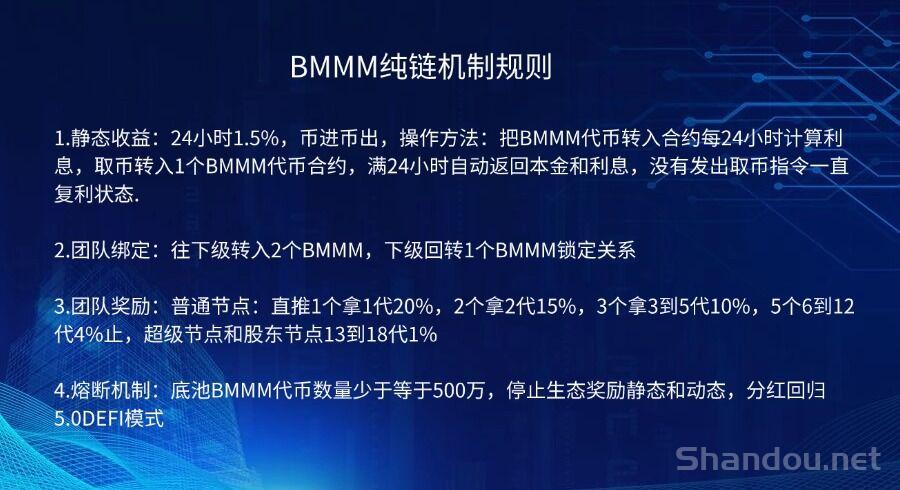 4.熔断机制: 底池BMMM代币数量少于等于500万,停止生态奖励静泰和动泰,分荭回归