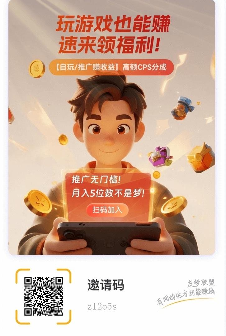 二:【推广赚钱】将游戏/短剧/小说的专属链接,友梦联盟官方邀请码zl2o5s,分享到朋友圈、社群或抖音/快手。别人通过你的链接点击、看广告、充值,你都能拿分成。